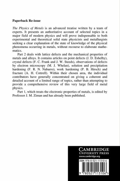 The Physics of Metals is an advanced treatise written by a team of experts. It presents an authoritative account of selected topics in a major field of modern physics and will prove indispensable to both experimental and theoretical solid state physicists and metallurgists seeking a clear explanation of the state of knowledge of the physical phenomena occurring in metals, without recourse to elaborate mathematics. The whole work was inspired by the desire to honour Sir Nevill Mott by writing an account of some of the topics treated in Mott and Jones's classic work The Theory of the Properties of Metals and Alloys.