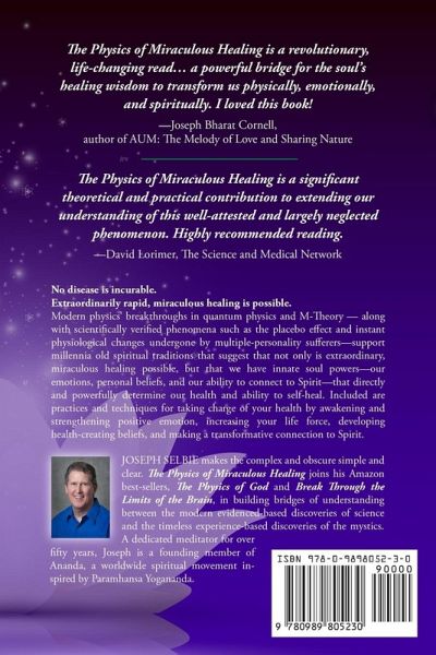 The Physics of Miraculous Healing Joseph Selbie No disease is incurable. Extraordinarily rapid, miraculous healing is possible. During a near-death experience, an end-stage terminal cancer patient with hours to live had a profound, emotionally transformative experience in which she let go of all fear-she rallied and became cancer free in a few short weeks. Brain scans revealed that a multiple-personality sufferer becomes physically blind in only one of ten personalities-when a new personality emerges, her sight returns. A devout woman, body twisted, wasted, and brought to the brink of death by sixteen years of multiple sclerosis, heard a Voice, stood up, and walked-she was completely healed in minutes. Modern physics, not modern medicine, can explain extraordinary healing. Despite the fact that these and thousands of similarly amazing cases have been medically verified, most doctors and, indeed, most people believe that such cases simply cannot be true because the science underlying modern medicine doesn't provide any explanation for how such extraordinarily rapid physical change could be possible. Medicine's underlying science, however, has changed little despite nearly a hundred years of breakthroughs in physics-such as matter-energy equivalence, nonlocality, and the holographic principle-breakthroughs that do provide scientific explanations for these cases. You have innate soul powers for self-healing. Modern physics' breakthroughs-along with scientifically verified phenomena such as the placebo effect and the widely studied negative impact of fear, anger, and depression on health-support millennia old spiritual traditions that suggest that not only is extraordinary, miraculous healing possible, but that we have innate soul powers-our emotions, personal beliefs, and our ability to connect to Spirit-that directly and powerfully determine our health and ability to self-heal. You can take charge of your health. Modern medicine's outdated science gives us a limited view of health and healing that puts uncontrollable influences, genes and disease, in charge of our health. Modern physics and experiential spiritual traditions give us an unlimited view of health and healing that puts controllable influences, emotion, belief, and connection to Spirit, in charge. You can self-heal from serious, even terminal, disease. Our soul powers can be methodically used to develop resilient health and to increase our ability to self-heal from serious, even terminal, disease. In this book you will find many practical ways to awaken and strengthen positive emotion, increase your life force, develop health-creating beliefs, and make a transformative connection to Spirit. Practices and techniques include: meditation, deep relaxation, affirmation, energization, concentration, and more. The Physics of Miraculous Healing is a companion to Selbie's Amazon Best-Sellers, The Physics of God and Break Through the Limits of the Brain . These books are bridges of understanding between the modern evidenced-based discoveries of science and the timeless experience-based discoveries of the mystics.