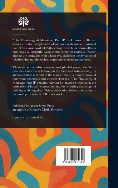 "The Physiology of Marriage, Part II" by Honore de Balzac delves into the complexities of wedlock with wit and satirical flair. This classic work of 19th-century French literature offers a humorous yet insightful social commentary on marriage. Balzac dissects the institution with a keen eye, exploring the dynamics of relationships and the societal expectations surrounding them. Through astute observations and playful prose, the book provides a timeless reflection on the trials and tribulations, joys and absurdities inherent in the married state. A treasure trove of humorous anecdotes and satirical sketches, "The Physiology of Marriage, Part II" remains relevant for anyone interested in the intricacies of human connection and the enduring challenges of building a life together. This republication offers a meticulously prepared print edition of Balzac's work. This work has been selected by scholars as being culturally important, and is part of the knowledge base of civilization as we know it. This work is in the public domain in the United States of America, and possibly other nations. Within the United States, you may freely copy and distribute this work, as no entity (individual or corporate) has a copyright on the body of the work. Scholars believe, and we concur, that this work is important enough to be preserved, reproduced, and made generally available to the public. We appreciate your support of the preservation process, and thank you for being an important part of keeping this knowledge alive and relevant.