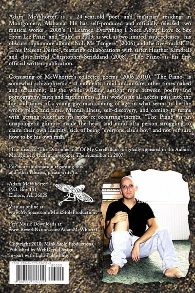 "The Piano" is somewhat schizophrenic - at moments timid and unsure, other times naked and screaming; all the while walking a tight rope between poetry and pornography, faith and faithlessness. Consisting of Adam McWhorter's collected poems (2006-2010), this collection is an unapologetic glimpse inside the heart and mind of a person struggling to claim their own identity; sick of being "everyone else's boy" and not yet sure how to be his own man.