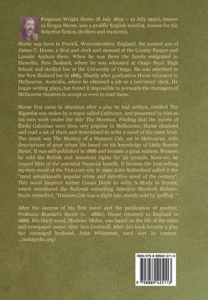 A mysterious Storyby Fergus Hume About the author Ferguson Wright Hume (8 July 1859 - 12 July 1932), known as Fergus Hume, was a prolific English novelist, known for his detective fiction, thrillers and mysteries. Hume was born in Powick, Worcestershire, England, the second son of James C. Hume, a Scot and clerk and steward at the County Pauper and Lunatic Asylum there. When he was three the family emigrated to Dunedin, New Zealand, where he was educated at Otago Boys' High School and studied law at the University of Otago. He was admitted to the New Zealand bar in 1885. Shortly after graduation Hume relocated to Melbourne, Australia, where he obtained a job as a barristers' clerk. He began writing plays, but found it impossible to persuade the managers of Melbourne theatres to accept or even to read them. Hume first came to attention after a play he had written, entitled The Bigamist was stolen by a rogue called Calthorpe, and presented by him as his own work under the title The Mormon. Finding that the novels of Émile Gaboriau were then very popular in Melbourne, Hume obtained and read a set of them and determined to write a novel of the same kind. The result was The Mystery of a Hansom Cab, set in Melbourne, with descriptions of poor urban life based on his knowledge of Little Bourke Street. It was self-published in 1886 and became a great success. Because he sold the British and American rights for 50 pounds, however, he reaped little of the potential financial benefit. It became the best-selling mystery novel of the Victorian era; in 1990 John Sutherland called it the "most sensationally popular crime and detective novel of the century". This novel inspired Arthur Conan Doyle to write A Study in Scarlet, which introduced the fictional consulting detective Sherlock Holmes. Doyle remarked, "Hansom Cab was a slight tale, mostly sold by 'puffing'." After the success of his first novel and the publication of another, Professor Brankel's Secret (c. 1886), Hume returned to England in 1888. His third novel, Madame Midas, was based on the life of the mine and newspaper owner Alice Ann Cornwell. After this book became a play her estranged husband, John Whiteman, sued over its content. ...(wikipedia.org)