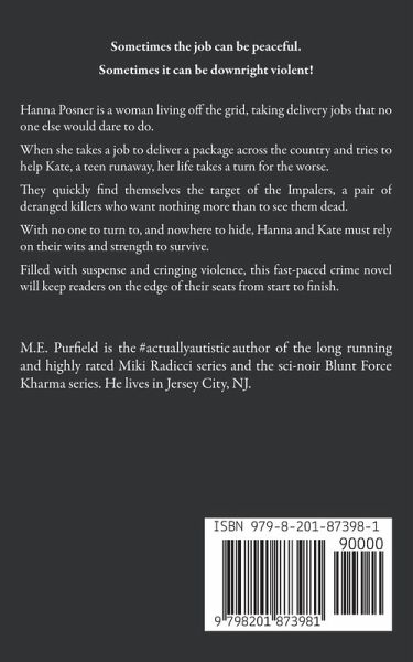 Sometimes the job can be peaceful. Sometimes it can be downright violent! Hanna Posner is a woman living off the grid, taking delivery jobs that no one else would dare to do. When she takes a job to deliver a package across the country and tries to help Kate, a teen runaway, her life takes a turn for the worse. They quickly find themselves the target of the Impalers, a pair of deranged killers who want nothing more than to see them dead. With no one to turn to, and nowhere to hide, Hanna and Kate must rely on their wits and strength to survive. Filled with suspense and cringing violence, this fast-paced crime novel will keep readers on the edge of their seats from start to finish.