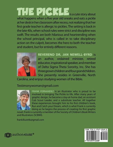 The Pickle is a cute story about what happens when a five year old sneaks and eats a pickle at her desk in her classroom after recess, not realizing that her first grade teacher is allergic to pickles. The setting is back in the late 40s, when school rules were strict and discipline was swift. The results are both hilarious and heartrending when the school principal, who is called in to take disciplinary action on the culprit, becomes the hero to both the teacher and student, but for entirely different reasons.