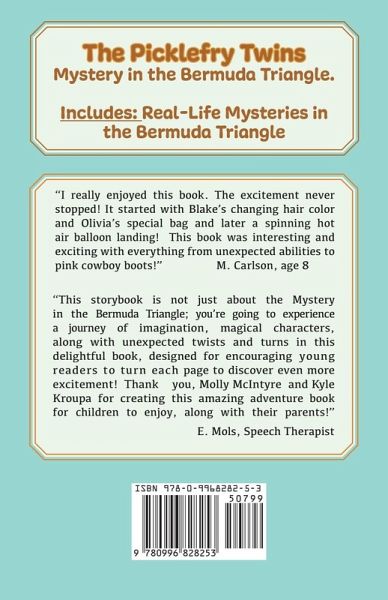 What if you got home from school and found your parents were lost somewhere in the Bermuda Triangle? Young chapter book readers will love this new series! ir balloon, struggling with the mysterious effects of the Bermuda Triangle, and seeking the antidote to wake up the passengers of the plane. The appendix includes three real-life mysteries in the Bermuda Triangle including: The ghost ship of the Mary Celeste, the missing USS Cyclops, and the ill-fated Flight 19. Coming soon is book two:, The Picklefry Twins and the Mystery of the Faceless Cats. · "I really enjoyed this book. The excitement never stopped! It started with Blake's changing hair color and Olivia's special bag and later a spinning hot air balloon landing! This book was interesting and exciting with everything from unexpected abilities to pink cowboy boots!" M. Carlson, age 9 · "This storybook is not just about the mystery in the Bermuda Triangle; you're going to experience a journey of imagination, magical characters, along with unexpected twists and turns in this delightful book, designed for encouraging young readers to turn each page to discover even more excitement! Thank you, Molly McIntyre and Kyle Kroupa for creating this amazing adventure book for children to enjoy, along with their parents!" E. Mols, Speech Therapist