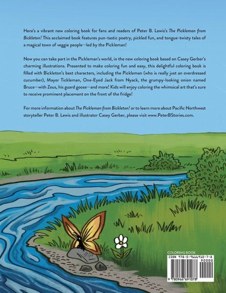 Here's a vibrant new coloring book for fans and readers of Peter B. Lewis's The Pickleman from Bickleton! This acclaimed book features pun-tastic poetry, pickled fun, and tongue-twisty tales of a magical town of veggie people-led by the Pickleman! Now you can take part in the Pickleman's world, in the new coloring book based on Casey Gerber's charming illustrations. Presented to make coloring fun and easy, this delightful coloring book is filled with Bickleton's best characters, including the Pickleman (who is really just an overdressed cucumber), Mayor Tickleman, One-Eyed Jack from Nyack, the grumpy-looking onion named Bruce-with Zeus, his guard goose-and more! Kids will enjoy coloring the whimsical art that's sure to receive prominent placement on the front of the fridge! For more information about The Pickleman from Bickleton! or to learn more about Pacific Northwest storyteller Peter B. Lewis and illustrator Casey Gerber, please visit www.PeterBStories.com.