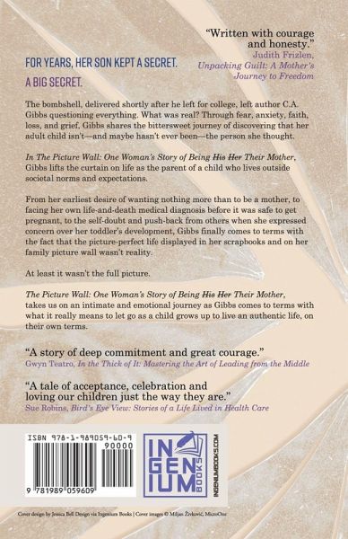 Testing expectations of motherhood and faith, this haunting and breathtakingly-honest depiction of the transformation of a family through the mystery of gender questioning and identity is a dual story of awakening: of the heart of a mother towards her transgendered child, and of the child's awakening to his, her, their fluidity of gender. FOR YEARS, HER SON KEPT A SECRET. A BIG SECRET. The bombshell, delivered shortly after he left for college, left author C.A. Gibbs questioning everything. What was real? Was she being a good parent? Through fear, anxiety, faith, loss, and grief, Gibbs shares the remarkable experiences triggered by the discovery that her adult child isn't-and maybe hasn't ever been-the person she thought. In The Picture Wall: One Woman's Story of Being His Her Their Mother, Gibbs lifts the curtain on life with a child who lives outside societal norms and expectations. From her earliest desire of wanting nothing more than to be a mother, to facing her own life-and-death medical diagnosis before it was safe to get pregnant, to the self-doubt and push-back from others when she expressed concern over her toddler's development, Gibbs finally comes to terms with the fact that the picture-perfect life displayed in her scrapbooks and on her family picture wall wasn't reality. At least it wasn't the full picture. The Picture Wall: One Woman's Story of Being His Her Their Mother takes us on an intimate and emotional journey toward healing as Gibbs comes to terms with raising an autistic child, parenting a transgender adult child, telling family a child is transgender, letting go as children grow up to live authentic lives on their own terms, and embracing being empty nesters.