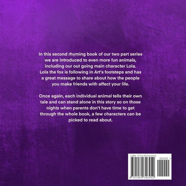 In this second rhyming book of a two-part series, we are introduced to even more fun animals, including our outgoing main character, Lola. Lola the fox is following in Art the fish's footsteps and has a great message to share about how the people you make friends with affect your life. Once again, each individual animal tells their own tale and can stand alone in this story so on those nights when parents don't have time to get through the whole book, a few characters can be picked to read about.