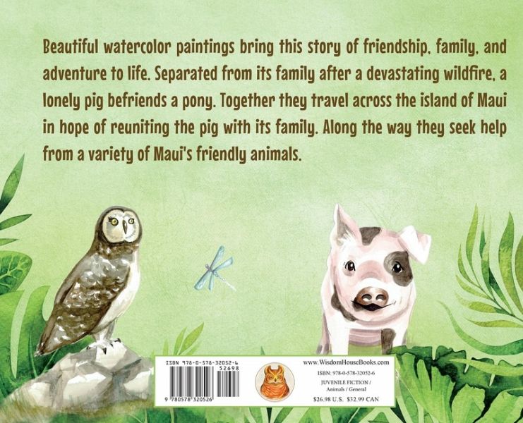 Beautiful watercolor paintings bring this story of friendship, inclusivity, and adventure to life. Separated from its family after a devastating wildfire, a lonely pig befriends a pony. Together they travel across the island of Maui in hopes of reuniting the pig with its family. Along the way they seek help from a variety of Maui's friendly animals.