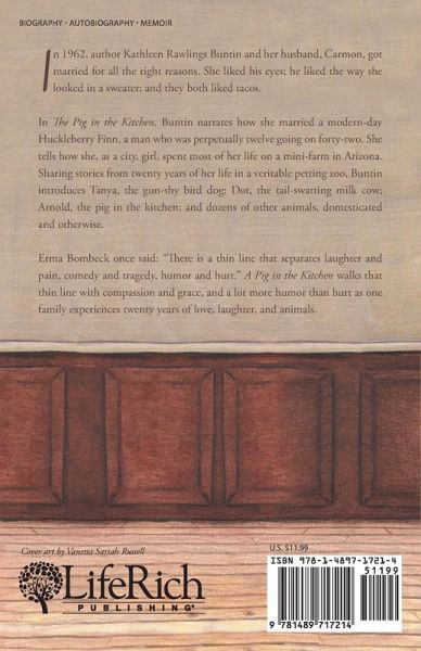 In 1962, author Kathleen Rawlings Buntin and her husband, Carmon, got married for all the right reasons. She liked his eyes, he liked the way she looked in a sweater, and they both liked tacos. In The Pig in the Kitchen, Buntin narrates how she married a modern-day Huckleberry Finn, a man who was perpetually twelve going on forty-two. She tells how she, as a city girl, spent most of her life on a minifarm in Arizona. Sharing stories from twenty years of her life in a veritable petting zoo, Buntin introduces Tanya, the gun-shy bird dog; Dot, the tail-swatting milk cow; Arnold, the pig in the kitchen; and dozens of other animals, domesticated and otherwise. Erma Bombeck once said, There is a thin line that separates laughter and pain, comedy and tragedy, humor and hurt. The Pig in the Kitchen walks that thin line with compassion and grace and a lot more humor than hurt as one family experiences twenty years of love, laughter, and animals.