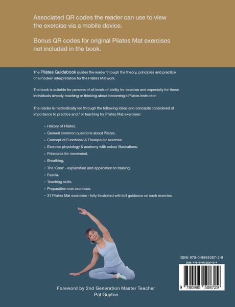 Pilates Mat Exercise handbook for teachers & enthusiasts. Contains QR codes for viewing on a mobile device The Pilates Guidebook takes the reader through the theory, principles and practice of a modern interpretation for the Pilates Matwork The book is suitable for persons of all levels of ability for exercise and especially for those persons already teaching or thinking about becoming a Pilates instructor The reader is methodically led through the following ideas and concepts considered of importance to practice and / or teach Pilates Mat exercises. History of Pilates 'Functional & Therapeutic' exercise Exercsie physiology & anatomy relavent to exercise Principles for movement Breathing The 'Core' - explanation and relevance to training Fascia Teaching skills Preparation mat exercises Fully illustrated exercises with QR codes to view the exercises on a mobile device
