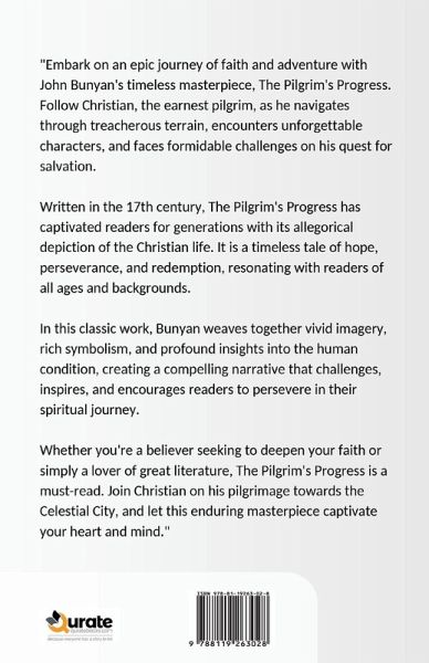 "Embark on an epic journey of faith and adventure with John Bunyan's timeless masterpiece, The Pilgrim's Progress. Follow Christian, the earnest pilgrim, as he navigates through treacherous terrain, encounters unforgettable characters, and faces formidable challenges on his quest for salvation. Written in the 17th century, The Pilgrim's Progress has captivated readers for generations with its allegorical depiction of the Christian life. It is a timeless tale of hope, perseverance, and redemption, resonating with readers of all ages and backgrounds. In this classic work, Bunyan weaves together vivid imagery, rich symbolism, and profound insights into the human condition, creating a compelling narrative that challenges, inspires, and encourages readers to persevere in their spiritual journey. Whether you're a believer seeking to deepen your faith or simply a lover of great literature, The Pilgrim's Progress is a must-read. Join Christian on his pilgrimage towards the Celestial City, and let this enduring masterpiece captivate your heart and mind."
