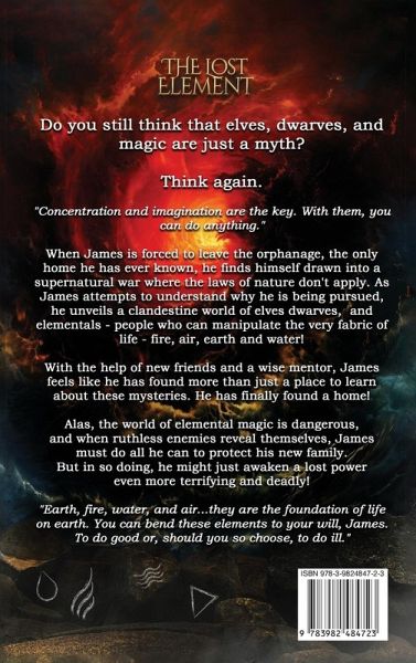 Do you still think that elves, dwarves, and magic are just a myth? Think again. "Concentration and imagination are the key. With them, you can do anything." When James is forced to leave the orphanage, the only home he has ever known, he finds himself drawn into a supernatural war where the laws of nature don't apply. As James attempts to understand why he is being pursued, he unveils a clandestine world of dwarves, elves, and elementals-people who can manipulate fire, air, earth, and water! With the help of new friends and a wise mentor, James feels like he has found more than just a place to learn about these mysteries. He has finally found a home! Alas, the world of elemental magic is dangerous, and when ruthless enemies reveal themselves, James must do all he can to protect his new family. But in so doing, he might just awaken a lost power even more terrifying and deadly! "Earth, fire, water, and air...they are the foundation of life on earth. You can bend these elements to your will, James. To do good or, should you so choose, to do ill."