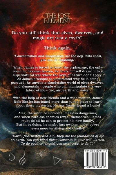 Do you still think that elves, dwarves, and magic are just a myth? Think again. "Concentration and imagination are the key. With them, you can do anything." When James is forced to leave the orphanage, the only home he has ever known, he finds himself drawn into a supernatural war where the laws of nature don't apply. As James attempts to understand why he is being pursued, he unveils a clandestine world of dwarves, elves, and elementals-people who can manipulate fire, air, earth, and water! With the help of new friends and a wise mentor, James feels like he has found more than just a place to learn about these mysteries. He has finally found a home! Alas, the world of elemental magic is dangerous, and when ruthless enemies reveal themselves, James must do all he can to protect his new family. But in so doing, he might just awaken a lost power even more terrifying and deadly! "Earth, fire, water, and air...they are the foundation of life on earth. You can bend these elements to your will, James. To do good or, should you so choose, to do ill."