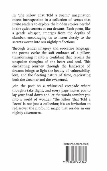 In "The Pillow That Told a Poem," imagination meets introspection in a collection of verses that invite readers to explore the hidden stories nestled in the quiet corners of our dreams. Each poem, like a gentle whisper, emerges from the depths of slumber, encouraging us to listen closely to the secrets woven into our nightly reflections. Through tender imagery and evocative language, the poems evoke the soft embrace of a pillow, transforming it into a confidant that reveals the unspoken thoughts of the heart and soul. This enchanting journey through the landscape of dreams brings to light the beauty of vulnerability, love, and the fleeting nature of time, captivating both the dreamer and the awakened. Join the poet on a whimsical escapade where thoughts take flight, and every page invites you to lay your head down and let the words comfort you into a world of wonder. "The Pillow That Told a Poem" is not just a collection; it's an invitation to rediscover the profound magic that resides in our nightly adventures.