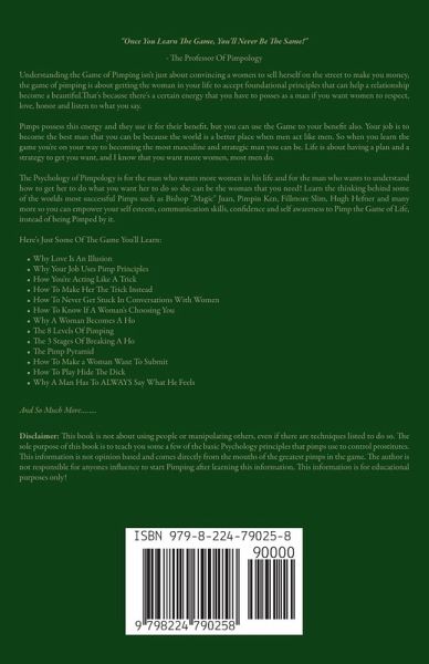 "Once You Learn The Game, You'll Never Be The Same!" - The Professor Of Pimpology Understanding the Game of Pimping isn't just about convincing a women to sell herself on the street to make you money, the game of pimping is about getting the woman in your life to accept foundational principles that can help a relationship become a beautiful.That's because there's a certain energy that you have to posses as a man if you want women to respect, love, honor and listen to what you say. Pimps possess this energy and they use it for their benefit, but you can use the Game to your benefit also. Your job is to become the best man that you can be because the world is a better place when men act like men. So when you learn the game you're on your way to becoming the most masculine and strategic man you can be. Life is about having a plan and a strategy to get you want, and I know that you want more women, most men do. The Psychology of Pimpology is for the man who wants more women in his life and for the man who wants to understand how to get her to do what you want her to do so she can be the woman that you need! Learn the thinking behind some of the worlds most successful Pimps such as Bishop "Magic" Juan, Pimpin Ken, Fillmore Slim, Hugh Hefner and many more so you can empower your self esteem, communication skills, confidence and self awareness to Pimp the Game of Life, instead of being Pimped by it. Here's Just Some Of The Game You'll Learn: Why Love Is An Illusion Why Your Job Uses Pimp Principles How You're Acting Like A Trick How To Make Her The Trick Instead How To Never Get Stuck In Conversations With Women How To Know If A Woman's Choosing You Why A Woman Becomes A Ho The 8 Levels Of Pimping The 3 Stages Of Breaking A Ho The Pimp Pyramid How To Make a Woman Want To Submit How To Play Hide The Dick Why A Man Has To ALWAYS Say What He Feels And So Much More........ Disclaimer: This book is not about using people or manipulating others, even if there are techniques listed to do so. The sole purpose of this book is to teach you some a few of the basic Psychology principles that pimps use to control prostitutes. This information is not opinion based and comes directly from the mouths of the greatest pimps in the game. Disclaimer: The author is not responsible for anyones influence to start Pimping after learning this information. This information is for educational purposes only!