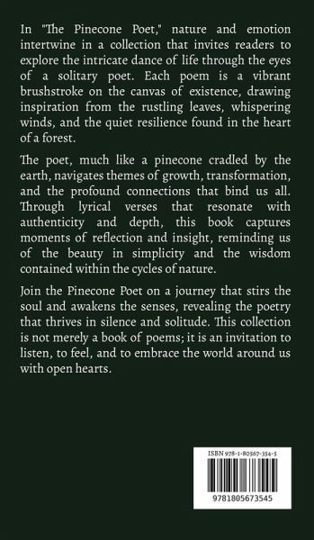 In "The Pinecone Poet," nature and emotion intertwine in a collection that invites readers to explore the intricate dance of life through the eyes of a solitary poet. Each poem is a vibrant brushstroke on the canvas of existence, drawing inspiration from the rustling leaves, whispering winds, and the quiet resilience found in the heart of a forest. The poet, much like a pinecone cradled by the earth, navigates themes of growth, transformation, and the profound connections that bind us all. Through lyrical verses that resonate with authenticity and depth, this book captures moments of reflection and insight, reminding us of the beauty in simplicity and the wisdom contained within the cycles of nature. Join the Pinecone Poet on a journey that stirs the soul and awakens the senses, revealing the poetry that thrives in silence and solitude. This collection is not merely a book of poems; it is an invitation to listen, to feel, and to embrace the world around us with open hearts.