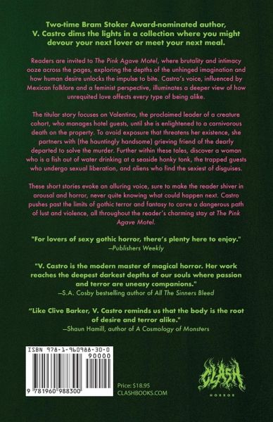 Two-time Bram Stoker Award-nominated author, V. Castro dims the lights in a collection where you might devour your next lover or meet your next meal. Readers are invited to The Pink Agave Motel,where brutality and intimacy ooze across the pages, exploring the depths of the unhinged imagination and how human desire unlocks the impulse to bite. Castro's voice, influenced by Mexican folklore and a feminist perspective, illuminates a deeper view of how unrequited love affects every type of being alike. The titular story focuses on Valentina, the proclaimed leader of a creature cohort, who manages hotel guests, until she is enlightened to a carnivorous death on the property. To avoid exposure that threatens her existence, she partners with (the hauntingly handsome) grieving friend of the dearly departed to solve the murder. Further within these tales, discover a woman who is a fish out of water drinking at a seaside honky tonk, the trapped guests who undergo sexual liberation, and aliens who find the sexiest of disguises. These short stories evoke an alluring voice, sure to make the reader shiver in arousal and horror, never quite knowing what could happen next. Castro pushes past the limits of gothic terror and fantasy to carve a dangerous path of lust and violence, all throughout the reader’s charming stay at The Pink Agave Motel.