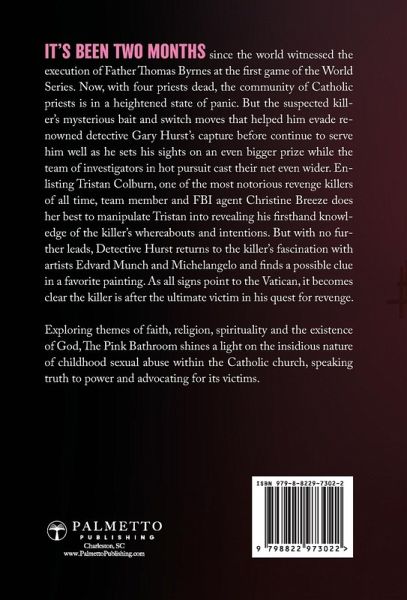 The Catholic church is one of the most powerful organizations known to man. But what happens when a traumatized altar boy turned killer sets his sights on revenge? A follow up to The Hand, The Pink Bathroom depicts another game of cat and mouse as a dangerous killer continues to evade capture by renowned detective Gary Hurst and his team of investigators while the once-untouchable community of priests, cardinals, and bishops find themselves on the edge of their pews fearing for their lives and praying for mercy. Always one step ahead, the killer pulls off unprecedented and nearly unthinkable executions with undeterred rage, taking a violent stand against the sexual abuse scandal that has persisted within the Catholic church for decades. Seeking to further understand the killer's intentions, the investigators turn to notorious revenge killer Tristan Colburn as a resource. While team member and FBI agent Christine Breeze does her best to manipulate Tristan into revealing the killer's whereabouts, Detective Hurst returns to the killer's fascination with art. When a particular piece offers a clue, Hurst and the others find themselves in hot pursuit in Rome, where the killer's plan to execute the ultimate symbol of the Catholic church is finally within his grasp. Spotlighting the insidious nature of childhood sexual abuse within the Catholic church, this thrilling novel inspired by true events reveals a pathway to truth, inspiring sexual abuse survivors to speak out and get help.