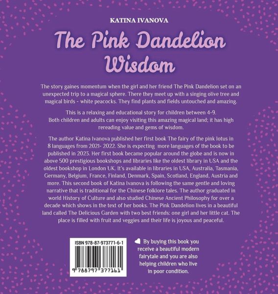 The Pink Dandelion lives in a beautiful land called The Delicious Garden with two best friends: one girl and her little cat. The place is filled with fruit and veggies and their life is joyous and peaceful. The story gaines momentum when the girl and her friend The Pink Dandelion set on an unexpected trip to a magical sphere. There they meet up with a singing olive tree and magical birds - white peacocks. They find plants and fields untouched and amazing. The author Katina Ivanova published her first book The fairy of the pink lotus in 8 languages from 2021- 2022. She is expecting more languages of the book to be published in 2023. Her first book became popular around the globe and is now in above 500 prestigious bookshops and libraries like the oldest library in USA and the oldest bookshop in London UK. It's available in libraries in USA, Australia, Tasmania, Germany, Belgium, France, Finland, Denmark, Spain, Scotland, England, Austria and more. This second book of Katina Ivanova is following the same gentle and loving narrative that is traditional for the Chinese folklore tales. The author graduated in world History of Culture and also studied Chinese Ancient Philosophy for over a decade which shows in the text of her books. This is a relaxing and educational story for children between 4-9. Both children and adults can enjoy visiting this amazing magical land; it has high rereading value and gems of wisdom. By buying this book you receive a beautiful modern fairytale and you are also helping children who live in poor condition.