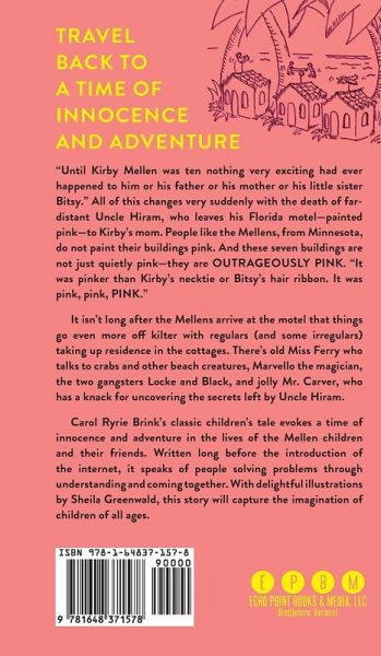 Travel Back to a Time of Innocence and Adventure "Until Kirby Mellen was ten nothing very exciting had ever happened to him or his father or his mother or his little sister Bitsy." All of this changes very suddenly with the death of far-distant Uncle Hiram, who leaves his Florida motel-painted pink-to Kirby's mom. People like the Mellens, from Minnesota, do not paint their buildings pink. And these seven buildings are not just quietly pink-they are outrageously PINK. "It was pinker than Kirby's necktie or Bitsy's hair ribbon. It was pink, pink, PINK." It isn't long after the Mellens arrive at the motel that things go even more off kilter with regulars (and some irregulars) taking up residence in the cottages. There's old Miss Ferry who talks to crabs and other beach creatures, Marvello the magician, the two gangsters Locke and Black, and jolly Mr. Carver, who has a knack for uncovering the secrets left by Uncle Hiram. Carol Ryrie Brink's classic children's tale evokes a time of innocence and adventure in the lives of the Mellen children and their friends. Written long before the introduction of the internet, it speaks of people solving problems through understanding and coming together. With delightful illustrations by Sheila Greenwald, this story will capture the imagination of children of all ages. This book is also available from Echo Point as a paperback (ISBN 1648371582).