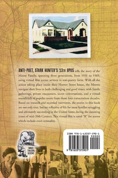 Anti-Poet, Stark Hunter's 13th opus tells the story of the Moore Family, spanning three generations, from 1931 to 1969, using virtual film scenes written in anti-poetry form. With all the action taking place inside their Hoover Street house, the Moores navigate their lives in both challenging and good times, with family gatherings, private encounters, secret conversations, and a virtual soundtrack of popular music from those four transcendent decades. Based on research and recorded interviews, the stories in this book are not only true, but are reflective of life for most families struggling and ultimately succeeding in the United States during the daunting times of mid-20th Century.