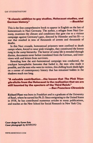 This is the first comprehensive book in English on the fate of the homosexuals in Nazi Germany. The author, a German refugee, examines the climate and conditions that gave rise to a vicious campaign against Germany's gays, as directed by Himmler and his SS--persecution that resulted in tens of thousands of arrests and thousands of deaths. In this Nazi crusade, homosexual prisoners were confined to death camps where, forced to wear pink triangles, they constituted the lowest rung in the camp hierarchy. The horror of camp life is described through diaries, previously untranslated documents, and interviews with and letters from survivors, revealing how the anti-homosexual campaign was conducted, the crackpot homophobic fantasies that fueled it, the men who made it possible, and those who were its victims, this chilling book sheds light on a corner of twentieth-century history that has been hidden in the shadows much too long.