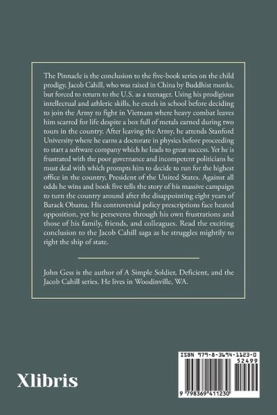 The Pinnacle is the conclusion to the five-book series on the child prodigy, Jacob Cahill, who was raised in China by Buddhist monks, but forced to return to the U.S. as a teenager. Using his prodigious intellectual and athletic skills, he excels in school before deciding to join the Army to fight in Vietnam where heavy combat leaves him scarred for life despite a box full of metals earned during two tours in the country. After leaving the Army, he attends Stanford University where he earns a doctorate in physics before proceeding to start a software company which he leads to great success. Yet he is frustrated with the poor governance and incompetent politicians he must deal with which prompts him to decide to run for the highest office in the country, President of the United States. Against all odds he wins and book five tells the story of his massive campaign to turn the country around after the disappointing eight years of Barack Obama. His controversial policy prescriptions face heated opposition, yet he perseveres through his own frustrations and those of his family, friends, and colleagues. Read the exciting conclusion to the Jacob Cahill saga as he struggles mightily to right the ship of state.