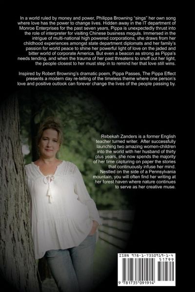 In a world ruled by money and power, Philippa "Pippa" Browning "sings" her own song where love has the power to change lives. Tucked away in the IT department of Monroe Enterprises for the past seven years, Pippa is unexpectedly thrust into the role of interpreter for visiting Chinese business moguls. Suddenly immersed in the intrigue of multi-national high powered corporations, her gestalt comes into direct conflict with Adam Monroe, CEO and heir to the Monroe fortune who, forced to take up the reins of Monroe Enterprises when his father absconded, bitterly runs his company fairly yet with cold precision. Undeterred, Pippa draws from her childhood experiences amongst state department diplomats and her family's passion for world peace to shine her powerful light of love on the jaded and bitter world of corporate America causing Adam to rethink his somewhat harsh business tactics and broken familial relationships. But even a beacon as strong as Pippa's needs tending, and when the trauma of her past threatens to snuff out her light, Adam and the people closest to her must step in to remind her that love still wins. Inspired by Robert Browning's dramatic poem, Pippa Passes, The Pippa Effect presents a modern day re-telling of the timeless theme where one person's love and positive outlook forever changes the lives of people passing by.