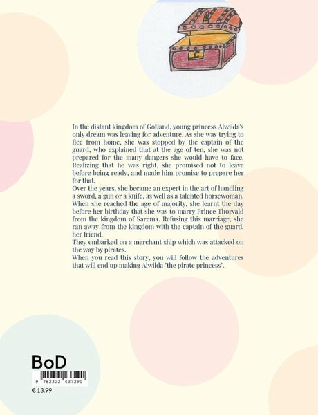 In the distant kingdom of Gotland, young princess Alwilda's only dream was leaving for adventure. As she was trying to flee from home, she was stopped by the capitain of the guard, who explained that at the age of ten, she was not prepared for the many dangers she would have to face. Realizing that he was right, she promised not to leave before being ready, and made him promise to prepare her for that.Over the years, she became an expert in the art of handling a sword, a gun or a knife, as well as a talented horsewoman.When she reached the age of majority, she learnt the day before her birthday that she was to marry Prince Thorvald from the kingdom of Sarema. Refusing this marriage, she ran away from the kingdom with the capitain of the guard, her friend.They embarked on a merchant ship which was attacked on the way by pirates.When you read this story, you will follow the adventures that will end up making Alwilda "the pirate princess".