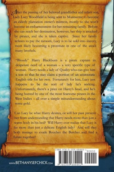 After the passing of her beloved grandfather and infant son, Lady Lucy Woodfield is being sent to Montserrat to become an elderly plantation owner's mistress. Before she can reach her destination, however, her ship is attacked by pirates, and she is taken captive. "Bloody" Harry Blackburn is a pirate captain in desperate need of a woman - a very specific type of woman. Harry needs a lady of Quality who can give him a son so that he may claim a portion of an aristocratic English title for his own. Fortunately for him, Lucy just happens to be the sort of lady he's seeking. Unfortunately, there's a price on Harry's head, and he's being hunted by one of the most fearsome pirates in the West Indies - all over a simple misunderstanding about some gold. Can Lucy be what Harry desires, or will her past prevent her from understanding that Harry needs more than just a warm body in his bed? Will Harry ever realize that Lucy is far more than just a delicate English lady?