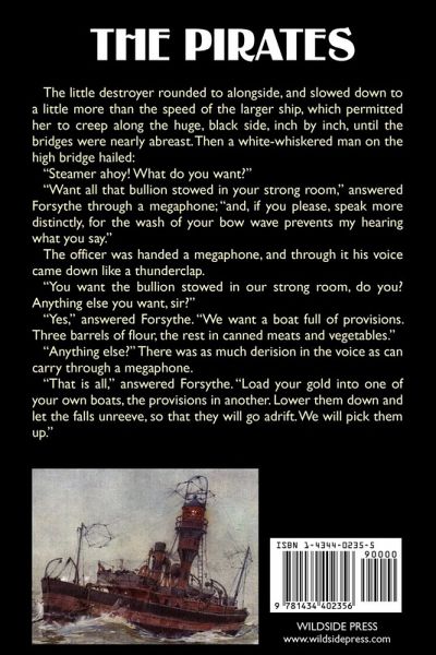 The little destroyer rounded to alongside, and slowed down to a little more than the speed of the larger ship, which permitted her to creep along the huge, black side, inch by inch, until the bridges were nearly abreast. Then a white-whiskered man on the high bridge hailed: "Steamer ahoy! What do you want?" "Want all that bullion stowed in your strong room," answered Forsythe through a megaphone. "Load your gold into one of your own boats, the provisions in another. Lower them down and let the falls unreeve, so that they will go adrift. We will pick them up."
