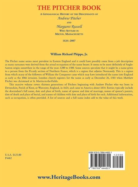The Pitcher name seems most prevalent in Eastern England and it could have possibly come from a job description as many surnames were derived from the actual occupation of the name bearer. It seems to be most definitely of Anglo-Saxton origin somewhere in the range of the years 1200 to 1500. Some sources speculate that it might be a name given to a person from the Picardy section of Northern France, which is a region that adjoins Normandy. This is a region from which many of the followers of William the Conqueror came which may have introduced the name into England as early as the 1066 invasion. London church registers list the name as early as December 26, 1581 when Matthew Pitcher was christened at St. Martin-in-the-Fields. This massive volume covers thirteen generations of Pitchers beginning with Andrew Pitcher who was born in Devonshire, Parish of Kent, or Worcester, England, in 1621; and came to America about 1634. Entries typically include the descendant's full name, date and place of birth, name of spouse and date of marriage, names of spouse's parents, date of death and place of burial, and names of children with date and place of birth for each. Additional information, such as occupation, is often provided. A list of sources and a full name index add to the value of this work.