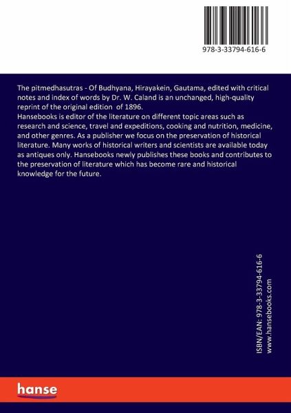 The pitmedhasutras - Of Budhyana, Hirayakein, Gautama, edited with critical notes and index of words by Dr. W. Caland is an unchanged, high-quality reprint of the original edition of 1896. Hansebooks is editor of the literature on different topic areas such as research and science, travel and expeditions, cooking and nutrition, medicine, and other genres. As a publisher we focus on the preservation of historical literature. Many works of historical writers and scientists are available today as antiques only. Hansebooks newly publishes these books and contributes to the preservation of literature which has become rare and historical knowledge for the future.