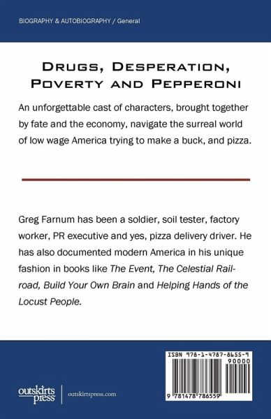 Now this: I finally got a job. From ad agency to pizza parlor. I'm a driver. I didn't realize how bad I was at first. A disaster. It's a wonder they didn't fire me...not finding the address, forgetting the salad. And again not finding the address. It went on and on. I'm better now, and getting accepted by the crew -- even though I'm two or three decades older than they are. And getting to know them. Where's Tim? And again, later, on another occasion, where's Tim. Trash talking big loud Gulf War One veteran, concerned father, former owner of a pizza place, number one employee -- both driver and cook...seems to know every address in our territory ("After you turn off Perry," he tells me, "it's the first house on the second block on the left -- she's a Pontiac hillbilly whore but she'll give you a good tip") and every aspect of the kitchen. He doesn't show up. Again. His house has no hot water. And so begins this account of a curious cast of characters, brought together by fate and the economy, as they navigate the surreal world of low wage America trying to make a buck, and pizza. The author, Greg Farnum has been a soldier, soil tester, factory worker, PR executive and yes, pizza delivery driver. He has also documented modern America in his unique fashion in books like The Event, The Celestial Railroad, Build Your Own Brain and Helping Hands of the Locust People.