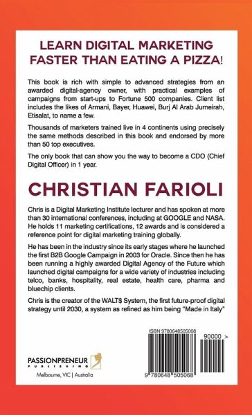 This book is rich with simple to advanced strategies from an awarded digital-agency owner, with practical examples of campaigns from start-ups to Fortune 500 companies. Client list includes the likes of Armani, Bayer, Huawei, Burj Al Arab Jumeirah, Etisalat, to name a few. More than 10,000 marketers trained live in 4 continents using precisely the same methods described in this book and endorsed by more than 50 top executives. The only book that can show you the way to become a CDO (Chief Digital Officer) in 1 year. Prof.Christian Farioli is a Digital Marketing Institute lecturer and has spoken at more than 60 international conferences, including at GOOGLE and NASA. He holds 11 marketing certifications, 12 awards and is considered a reference point for digital marketing training globally. He has been in the industry since its early stages where he launched the first B2B Google Campaign in 2003 for Oracle. Since then he has been running a highly awarded Digital Agency of the Future which launched digital campaigns for a wide variety of industries including telco, banks, hospitality, real estate, health care, pharma and bluechip clients. Prof.Christian is the creator of the WALT$ System, the first future-proof digital strategy until 2030, a system as refined as him being "Made in Italy"