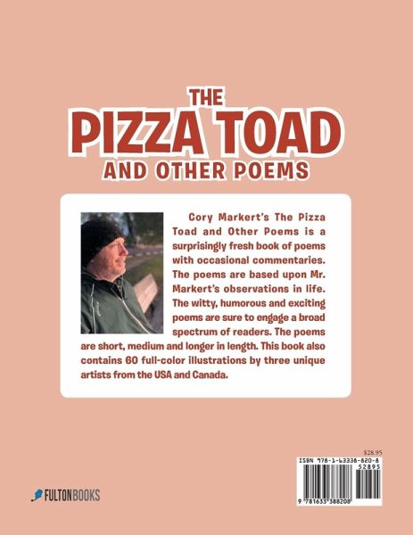 Cory Markert's The Pizza Toad and Other Poems is a wonderful book of poems with accompanying commentaries. The poems are based on Mr. Markert's observations, brainstorming, and imagination. This book includes funny, witty, and moving poems that are sure to please almost all ages. The poems are long, short and medium in length. This book also contains sixty beautiful, full-color illustrations by three talented artists.