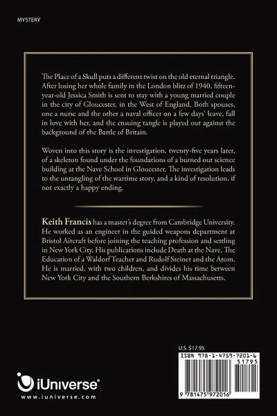 The Place of a Skull puts a different twist on the old eternal triangle. After losing her whole family in the London blitz of 1940, fifteen-year-old Jessica Smith is sent to stay with a young married couple in the city of Gloucester, in the West of England. Both spouses, one a nurse and the other a naval officer on a few days' leave, fall in love with her, and the ensuing tangle is played out against the background of the Battle of Britain. Woven into this story is the investigation, twenty-five years later, of a skeleton found under the foundations of a burned out science building at the Nave School in Gloucester. The investigation leads to the untangling of the wartime story, and a kind of resolution, if not exactly a happy ending.