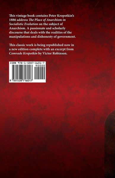 This vintage book contains Peter Kropotkin's 1886 address "The Place of Anarchism in Socialistic Evolution" on the subject of Anarchism. A passionate and scholarly discourse that deals with the realities of the manipulations and dishonesty of government, this volume is recommended for those with an interest in anarchism, Marxism, and political science. Pyotr Alexeyevich Kropotkin (1842-1921) was a Russian writer, activist, revolutionary, economist, scientist, sociologist, essayist, historian, researcher, political scientist, geographer, geographer, biologist, philosopher and advocate of anarcho-communism. He was a prolific writer, producing a large number of pamphlets and articles, the most notable being "The Conquest of Bread and Fields, Factories and Workshops" and "Mutual Aid: A Factor of Evolution". This classic work is being republished now in a new edition complete with an excerpt from "Comrade Kropotkin" by Victor Robinson.