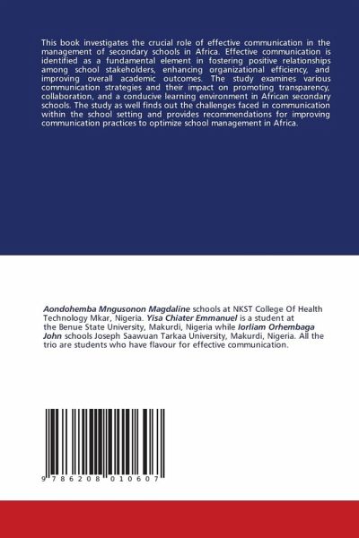 This book investigates the crucial role of effective communication in the management of secondary schools in Africa. Effective communication is identified as a fundamental element in fostering positive relationships among school stakeholders, enhancing organizational efficiency, and improving overall academic outcomes. The study examines various communication strategies and their impact on promoting transparency, collaboration, and a conducive learning environment in African secondary schools. The study as well finds out the challenges faced in communication within the school setting and provides recommendations for improving communication practices to optimize school management in Africa.