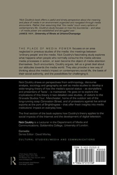 The Place of Media Power focuses on an area neglected in previous studies of the media: the meetings between ordinary people and the media. Couldry's fascinating study explores what happens when people who normally consume the media witness media processes in action, or even become the object of media attention themselves. Such encounters, Couldry argues, tell us a great deal about our attitudes towards the media world. They also offer a new way of thinking about the media's impact on contemporary social life, the basis of their social authority, and the possibliity of challenging it. Couldry draws on perspectives from anthropology, discourse analysis, sociology and geography as well as media studies to develop a wide-ranging theory of how the media's special status - as storytellers and presenters of facts - is maintained. He goes on to explore the implications of this theory in two detailed case studies, of visitors to the Granada Studios Tour, Manchester, home of the outdoor set.
