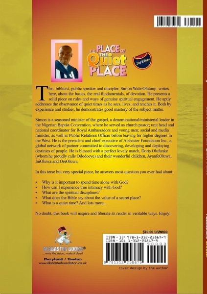 This biblicist, public speaker and discipler, Simon Wale Olatunji writes here, about the fundamentals of devotion: a solid piece on rules and ways of genuine spiritual engagement. He aptly addresses the observance of quiet times as he sees, lives, and teaches it. His wealth of experience as a minister of the gospel, life coach and leader of a global network of partner committed to helping people discover, develop and deploy destiny aid his doing justice to this very special piece. He answers most question you ever had about: The blessing of quiet living; Why is it important to spend time alone with God? How can I experience true intimacy with God? What are the spiritual disciplines? What does the Bible say about the value of a secret place? What is a quiet time? And lots more... This book was first published in Nigeria in 2010 by Alabaster Books with thousands of copies sold. This second edition comes with an improvement of its quality and content. It will inspire and liberate its reader in veritable ways.
