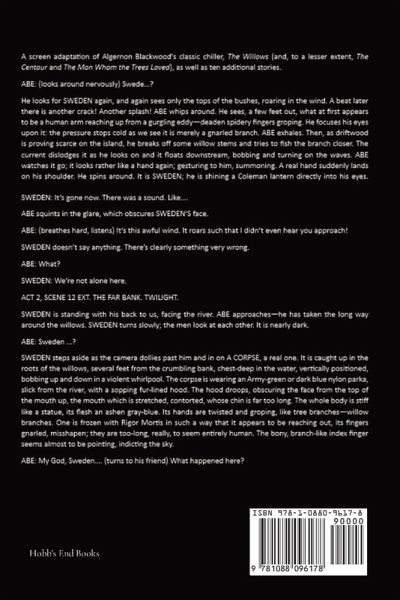 A screen adaptation of Algernon Blackwood's classic chiller, The Willows (and, to a lesser extent, The Centaur and The Man Whom the Trees Loved), as well as ten additional stories. ABE: (looks around nervously) Swede...? He looks for SWEDEN again, and again sees only the tops of the bushes, roaring in the wind. A beat later there is another crack! Another splash! ABE whips around. He sees, a few feet out, what at first appears to be a human arm reaching up from a gurgling eddy-deaden spidery fingers groping. He focuses his eyes upon it: the pressure stops cold as we see it is merely a gnarled branch. ABE exhales. Then, as driftwood is proving scarce on the island, he breaks off some willow stems and tries to fish the branch closer. The current dislodges it as he looks on and it floats downstream, bobbing and turning on the waves. ABE watches it go; it looks rather like a hand again; gesturing to him, summoning. A real hand suddenly lands on his shoulder. He spins around. It is SWEDEN; he is shining a Coleman lantern directly into his eyes. SWEDEN: It's gone now. There was a sound. Like.... ABE squints in the glare, which obscures SWEDEN'S face. ABE: (breathes hard, listens) It's this awful wind. It roars such that I didn't even hear you approach! SWEDEN hands ABE a flashlight. SWEDEN: Here. ABE: Where were they? SWEDEN: In the stern. Under the ballast. ABE: (exhales) I wish this wind would go down ... SWEDEN doesn't say anything. There's clearly something very wrong. ABE: What? SWEDEN: We're not alone here. ACT 2, SCENE 12 EXT. THE FAR BANK. TWILIGHT. SWEDEN is standing with his back to us, facing the river. ABE approaches-he has taken the long way around the willows. SWEDEN turns slowly; the men look at each other. It is nearly dark. ABE: Sweden ...? SWEDEN steps aside as the camera dollies past him and in on A CORPSE, a real one. It is caught up in the roots of the willows, several feet from the crumbling bank, chest-deep in the water, vertically positioned, bobbing up and down in a violent whirlpool. The corpse is wearing an Army-green or dark blue nylon parka, slick from the river, with a sopping fur-lined hood. The hood droops, obscuring the face from the top of the mouth up, the mouth which is stretched, contorted, whose chin is far too long. The whole body is stiff like a statue, its flesh an ashen gray-blue. Its hands are twisted and groping, like tree branches-willow branches. One is frozen with Rigor Mortis in such a way that it appears to be reaching out, its fingers gnarled, misshapen; they are too-long, really, to seem entirely human. The bony, branch-like index finger seems almost to be pointing, indicting the sky. ABE: My God, Sweden.... (turns to his friend) What happened here?