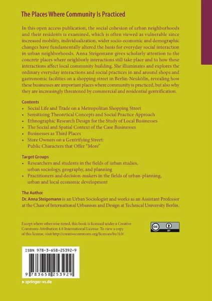 In this open access publication, the social cohesion of urban neighborhoods and their residents is examined, which is often viewed as vulnerable since increased mobility, individualization, wider socio-economic and demographic changes have fundamentally altered the basis for everyday social interaction in urban neighborhoods. Anna Steigemann gives scholarly attention to the concrete places where neighborly interactions still take place and to how these interactions affect local community building. She illuminates and explores the ordinary everyday interactions and social practices in and around shops and gastronomic facilities on a shopping street in Berlin-Neukölln, revealing how these businesses are important places where community is practiced, but also why they are increasingly threatened by commercial and residential gentrification.