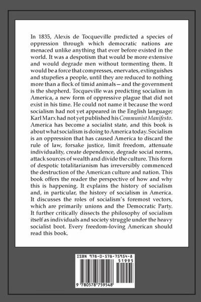 In 1835, Alexis de Tocqueville predicted a species of oppression with which democratic nations are menaced unlike anything which ever before existed in the world. It was a despotism that would be more extensive and would degrade men without tormenting them. It would be a force that compresses, enervates, extinguishes, and stupefies a people, til each is reduced to be nothing better than a flock of timid animals, of which the government is the shepherd. Tocqueville was predicting socialism in America, a new form of oppressive plague that did not exist in his time. He could not name it at the time because the word socialism had not yet appeared in the English language and Karl Marx had not yet published his Communist Manifesto. America has become a socialist state and this book is about what socialism is doing to America today. Socialism is an oppression that has caused America to discard the rule of law, forsake justice, limit freedom, attenuate individuality, create dependence, degrade social norms, attack sources of wealth and divide the culture. This form of despotic totalitarianism has irreversibly commenced the destruction of American culture and nation. This book offers the reader the perspective of and how and why this is happening. It explains the history of socialism and in particular the history of socialism in America. It discusses the roles of socialism's foremost vectors which are primarily unions and the Democratic Party. It further critically dissects the philosophy of socialism itself as individuals and society struggle under the heavy socialist boot. Every freedom-loving American should read this book.