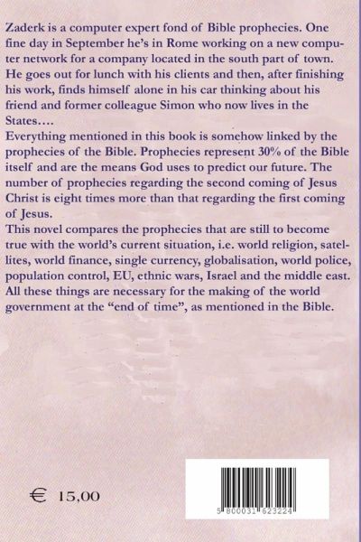 Zaderk goes out for lunch with his clients and then, after finishing his work, finds himself alone in his car thinking about his friend and former colleague Simon who now lives in the States.... Everything mentioned in this book is somehow linked by the prophecies of the Bible. Prophecies represent 30%% of the Bible itself and are the means God uses to predict our future. The number of prophecies regarding the second coming of Jesus Christ is eight times more than that regarding the first coming of Jesus. This novel compares the prophecies that are still to become true with the world's current situation, i.e. world religion, satellites, world finance, single currency, globalisation, world police, population control, EU, ethnic wars, Israel and the middle east. All these things are necessary for the making of the world government at the "end of time", as mentioned in the Bible.