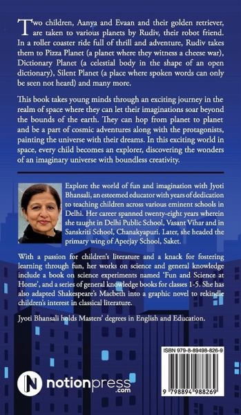 Two children, Aanya and Evaan and their golden retriever, are taken to various planets by Rudiv, their robot friend. In a roller coaster ride full of thrill and adventure, Rudiv takes them to Pizza Planet (a planet where they witness a cheese war), Dictionary Planet (a celestial body in the shape of an open dictionary), Silent Planet (a place where spoken words can only be seen not heard) and many more. This book takes young minds through an exciting journey in the realm of space where they can let their imaginations soar beyond the bounds of the earth. They can hop from planet to planet and be a part of cosmic adventures along with the protagonists, painting the universe with their dreams. In this exciting world in space, every child becomes an explorer, discovering the wonders of an imaginary universe with boundless creativity.