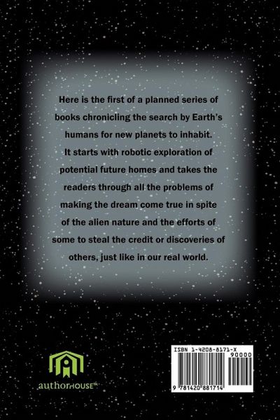 Here is the first of a planned series of books chronicling the search by Earth's humans for new planets to inhabit. It starts with robotic exploration of potential future homes and takes the readers through all the problems of making the dream come true in spite of the alien nature and the efforts of some to steal the credit or discoveries of others, just like in our real world.