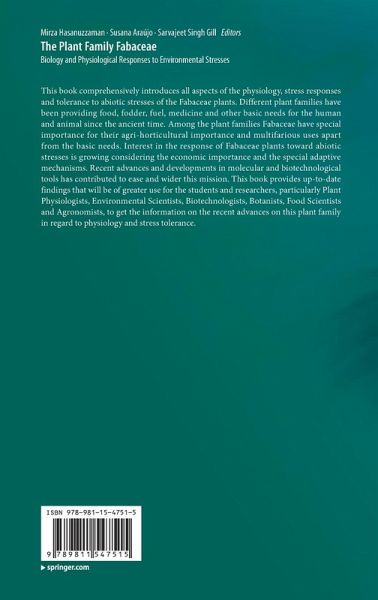1. The biology of legumes and their agronomic, economic and social impact.- 2.Tropical Legumes: Status, Distribution, Biology and Importance.- 3.Nitrogen fixation of legumes: Biology and physiology.- 4.Nitrogen fixation of legumes under the family Fabaceae: Adverse effect of abiotic stresses and mitigation strategies.- 5.Genetic engineering and genome editing for the improvement of Fabaceae for abiotic stress tolerance.- 6.GWAS and genomic approaches in Legumes, an expanding toolkit for examining responses to abiotic stresses.- 7.Use of Osmolytes for Improving Abiotic Stress Tolerance in Fabaceae Plants.- 8.Role of biostimulants for enhancing abiotic stress tolerance in Fabaceae plants.- 9.Abiotic and biotic stresses interaction in Fabaceae plants. Contributions from the grain legumes-soilborne vascular diseases-drought stress triangle.- 10.Leguminosae (nom. alt. Fabaceae) - Its Diversity, Use and Role in Environmental Conservation in the Harsh Environs of the Cold Deserts of North West India.- 11.Morphological, physiobiochemical and molecular adaptability of legumes of Fabaceae to drought stress, with special reference to Medicago sativa L..- 12.Phaseolus species responses and tolerance to drought.- 13.Fabaceae plants responses and tolerance to high temperature stress.- 14.Legume responses and adaptations to nutrient deficiencies.- 15.Nutrient Management for improving abiotic stress tolerance in legumes of the family Fabaceae.- 16.Fabaceous Plants Under Abiotic Stresses and Biochemical Functions of Micronutrients.- 17.Response and tolerance of Fabaceae plant to metal/metalloid toxicity.- 18.Oxidative stress and antioxidant defense in Fabaceae plants under abiotic stresses.- 19.Threat imposed by O3 induced ROS on defence, nitrogen fixation, physiology, biomass allocation and yield of legumes.- 20.Salinity Stress Responses in Three Popular Field Crops Belonging to Fabaceae Family: Current Status and Future Prospect.