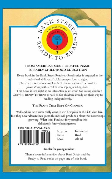 Will and his twin sister really want to win first prize at the 4-H club fair. But they never dream their green thumbs will produce a plant that never stops growing! What is it? Find out for yourself in this deliciously funny rhyming story! ¿FROM AMERICA'S MOST TRUSTED NAME IN EARLY CHILDHOOD EDUCATION More than seventy years of educational research and innovative teaching have given the Bank Street College of Education the reputation as America's most trusted name in early childhood education. Because no two children are exactly alike in their development, we have designed the Bank Street Ready-to-Read series in three levels to accommodate the individual stages of reading readiness of children ages four through eight. • Level 1: GETTING READY TO READ- (PRE-K to GRADE 1) Books are perfect for reading aloud with children who are getting ready to read or are just beginning to read words or phrases. • Level 2: READING TOGETHER-(GRADES 1 to 3) Books are written especiallly for children who are on their way to reading independently but who may need help. • Level 3: I CAN READ IT MYSELF-(GRADES 2 to 3) Books are designed for children able to read on their own. They also can be enjoyed as read-alouds.