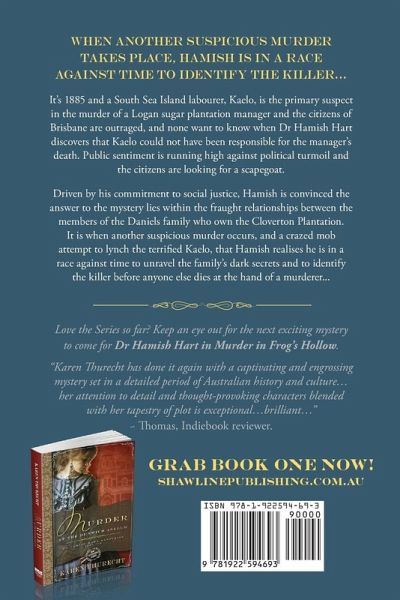 WHEN ANOTHER SUSPICIOUS MURDER TAKES PLACE, HAMISH IS IN A RACE AGAINST TIME TO IDENTIFY THE KILLER... It's 1885 and a South Sea Island labourer, Kaelo, is the primary suspect in the murder of a Logan sugar plantation manager and the citizens of Brisbane are outraged, and none want to know when Dr Hamish Hart discovers that Kaelo could not have been responsible for the manager's death. Public sentiment is running high against political turmoil and the citizens are looking for a scapegoat. Driven by his commitment to social justice, Hamish is convinced the answer to the mystery lies within the fraught relationships between the members of the Daniels family who own the Cloverton Plantation. It is when another suspicious murder occurs, and a crazed mob attempt to lynch the terrified Kaelo, that Hamish realises he is in a race against time to unravel the family's dark secrets and to identify the killer before anyone else dies at the hand of a murderer... "Karen Thurecht has done it again with a captivating and engrossing mystery set in a detailed period of Australian history and culture...her attention to detail and thought-provoking characters blended with her tapestry of plot is exceptional...brilliant..." Thomas, Indiebook reviewer